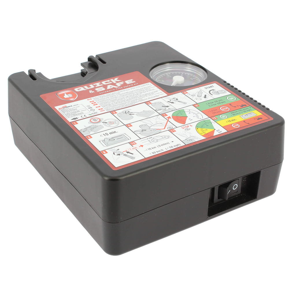 Als je een slappe band krijgt als je onderweg bent is deze thuisbrengset van Quick & Safe de oplossing. Plaats de flacon afdichtvloeistof volgens de bijgeleverde manual op de compressor en blaas jouw band vervolgens vol lucht vermengd met afdichtvloeistof. Je kunt als de autoband weer hard staat met een maximale snelheid van 50 km per uur jouw weg vervolgen om veilig thuis te komen.